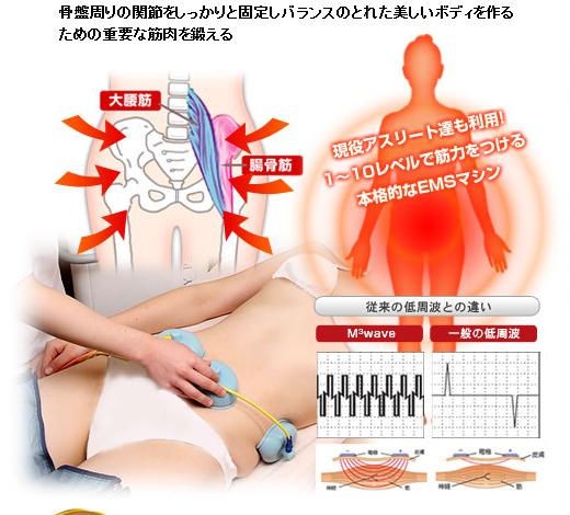 医療機器メーカーが開発した「Mキューブウェーブ」で、骨盤を支える筋肉を引き締めることで骨盤ケアしながら、たまった脂肪を燃焼 します。骨盤周りの関節をしっかりと固定しバランスのとれた美しいボディを作るために重要な筋肉を鍛えます。