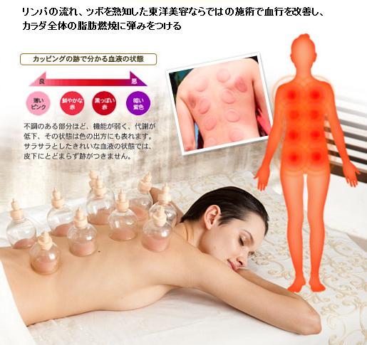 スリムポイントを適度なチカラで吸引することで、血行が促進され、体全体の体温が上昇し、脂肪燃焼に弾みがつき、痩せやすい体に導きます。 また、五臓全体のバランスを整え、新陳代謝を促すオリエンタルパックを塗り、ヒートマットで全身を包み込んで温めます。じわじわと温められて 代謝がUP。さらに、汗と一緒に老廃物を排出させるデトックス効果も期待できます。